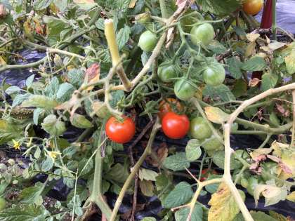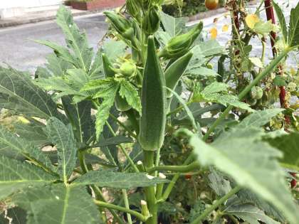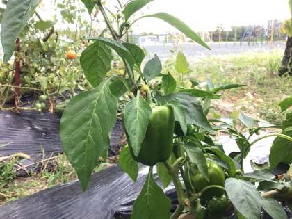 オクラとピーマンの実がとても大きく成長していました。トマトの花も咲いていました。