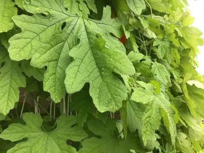 今日のツルレイシです。実が徐々に黄色くなってきています。また、今朝は雨が降っていたので葉の上に雨の滴がついていました。