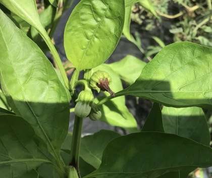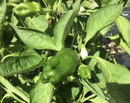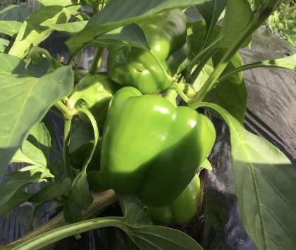 今朝のピーマンの様子です。大きな実が実っています。まだ、花も咲いています。