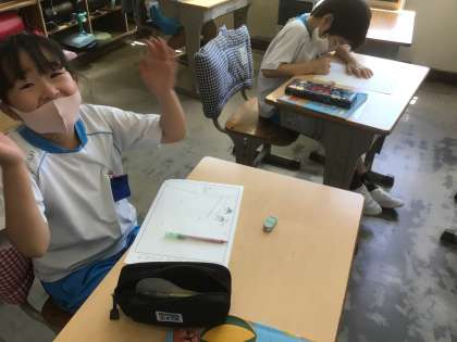 「わたしの町 はっけん」の学習です。自分の住む地域を思い出して、建物やお店、病院などどこに何があるのか、簡単に地図をかいて表しています。