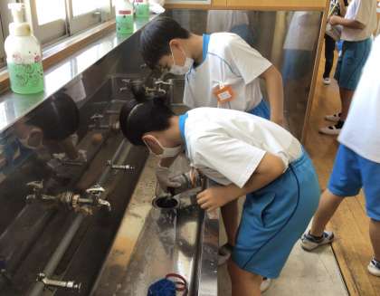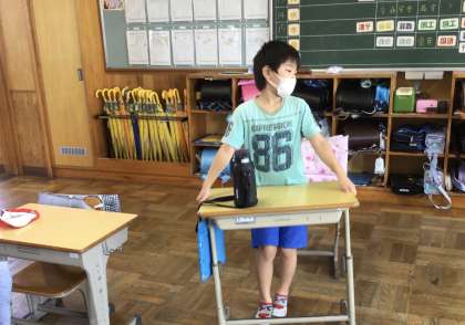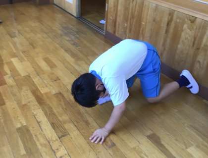 掃除の様子です。廊下の床を雑巾で丁寧に拭いたり、机を持ち上げて運んだりしています。