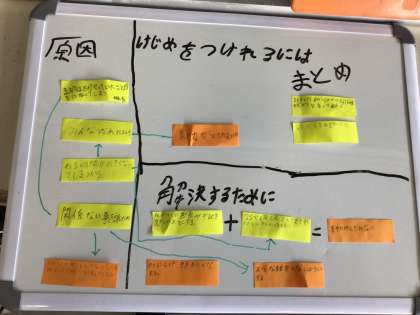 「問題を解決するために話し合おう」での話し合いで、子どもたちがまとめ終えたホワイトボードです。