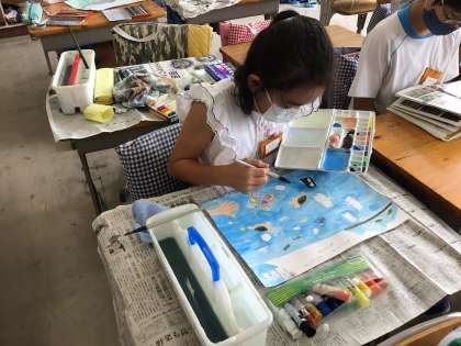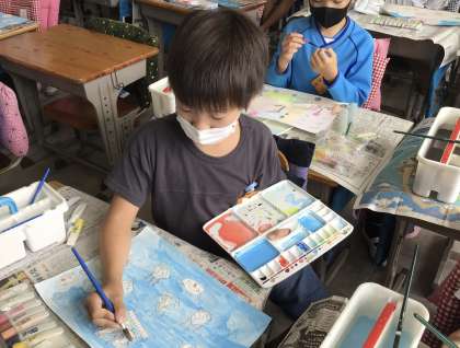 絵の具やクレヨン、色鉛筆などを使って表現しています。個性ある作品が出来上がっています。