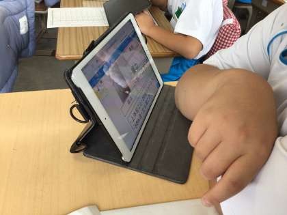 体力テストの結果を見返して、自分の運動能力についての長所と短所、自分に合ったスポーツを、考えたり調べたりしてまとめています。動くだけでなく、考える体育です。