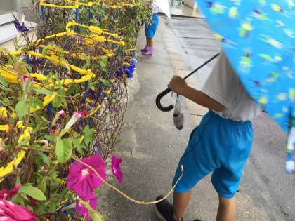 朝の様子です。この日は、雨が降っていたので傘を持ちながら、アサガオのタネを採取していました。