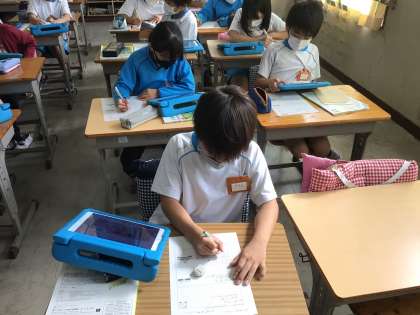 3組の社会の授業です。「自然災害からくらしを守る」のまとめをワークシートに記入しています。