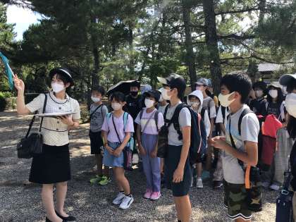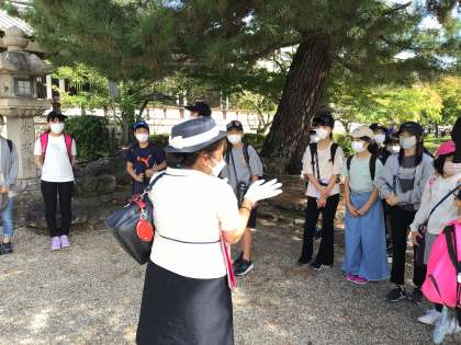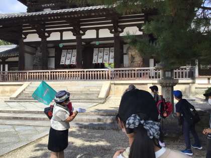 法隆寺にて。ガイドさんの説明を聞きながら見学しています。