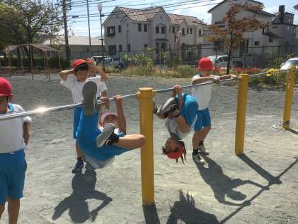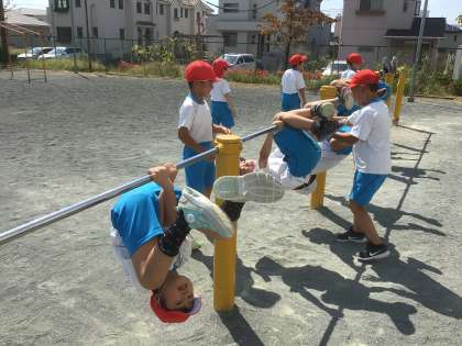 今日は、「ちきゅうまわり」の練習です。得意な友だちが、見本を見せてくれました。それを見て、みんなで練習しました。