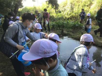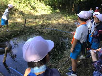 下におりると、小さな池がありました。小さな魚をすぐに見つけ「めだかだ!」という声がたくさん聞こえてきました。そして、すぐにザリガニつりの開始です。