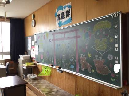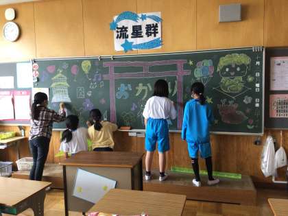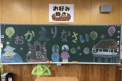 6年生が修学旅行から帰ってきたときに喜んでもらえるように…何日も練習してきた黒板アートをしあげました。月曜日、喜んでもらえたかな?