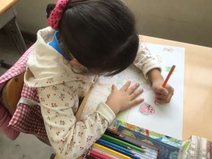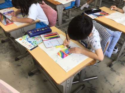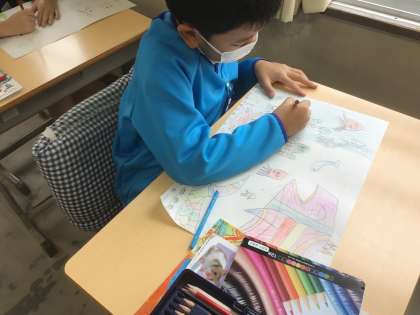 「読書感想画」の学習です。海の中の様子を表現している子が多いです。魚やいか、たこやくらげなど、出てくる生き物もいろいろです。