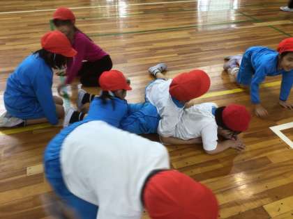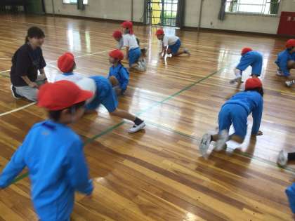いろいろな動物になりきって、自由に体で表現しています。