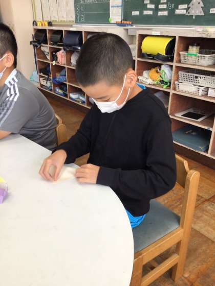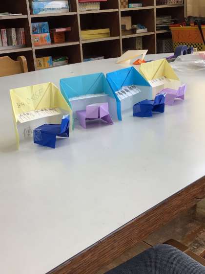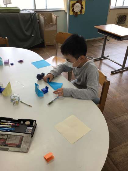 折り紙でピアノとイスを作りました。角と角がピッタリと合うように気をつけました。鍵盤の絵も描いて、今にも音が鳴り出しそうですね。