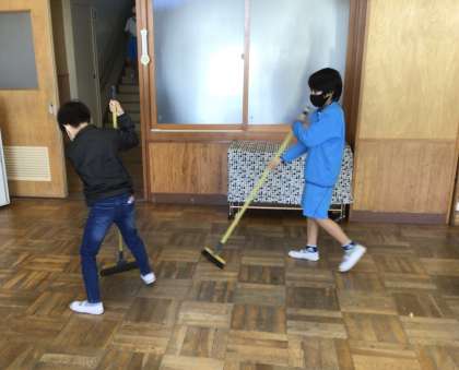 この日は、わくわくの日でした。教室の机を隅に寄せた後に綺麗に掃除をして、みんなが来るのを待ちました。