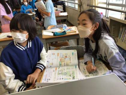 ペアを組んで、道案内の学習を行っています。みんな楽しそうに取り組めていました。