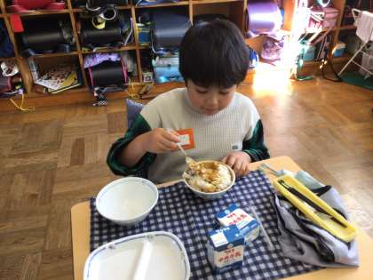 今日の給食は、カレーライスでした。カレーライスは、大人気でいつもよりもたくさん食べている子が多かったです。今日も残さず食べました。
