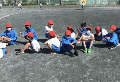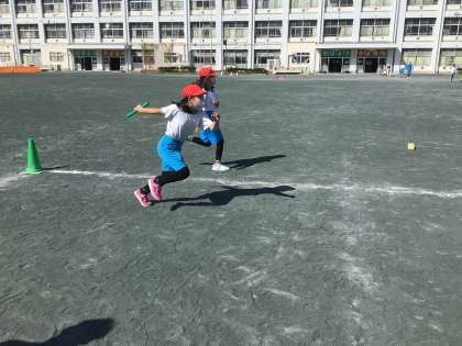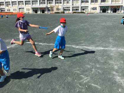 今日は、1組と4組が合同で授業を行いました。スポーツフェスタの種目である学級対抗リレーの練習です。本番通りに全員が走りました。