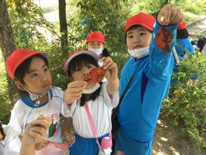 どんぐりころころどんぐりこ〜♪と口ずさみながら、いろいろな種類のどんぐりやきれいな色の落ち葉をたくさん見つけました。