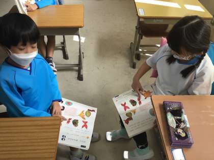 いろいろな形や色の葉っぱや木の実を見て、なにに見えるのか伝え合いました。