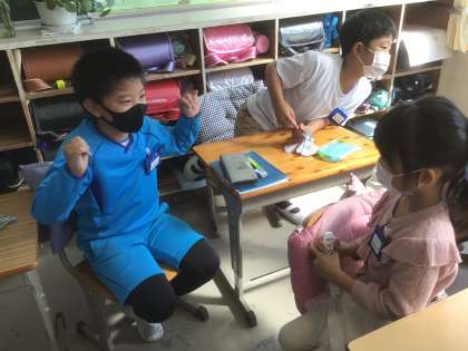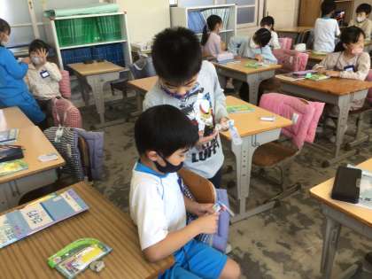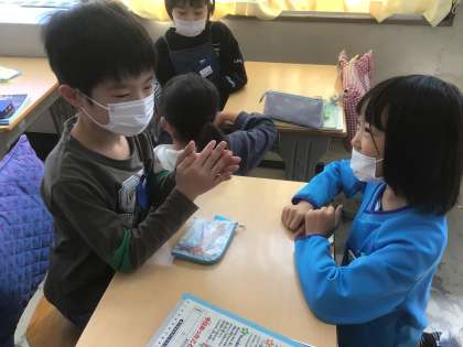 「かけ算」の学習が始まっています。みんな、九九カードをもって練習をがんばっています。