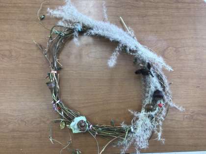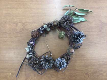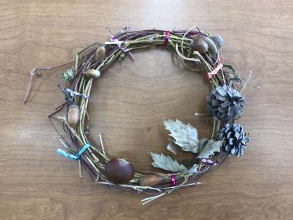 どんぐりやまつぼっくりをつけて、素敵なリースが完成しました。