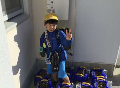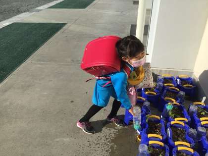 今朝の様子です。アサガオに水やりをしている1年生です。