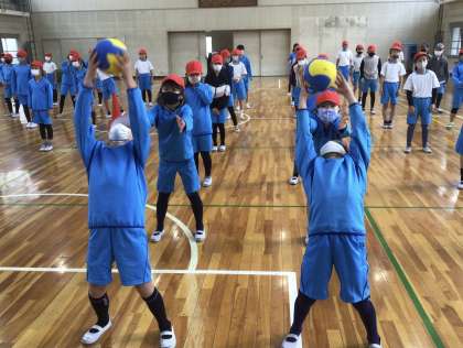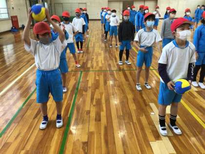 今日の体育の授業です。体を大きく使って、ボール渡しリレーを行いました。