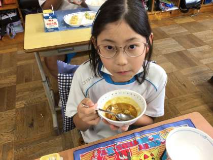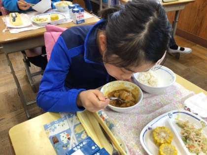 今日は、カレーライスの日でした。カレーライスの日は、ご飯が足りなくなります。カレーにトウモロコシを混ぜてコーンカレーライスにして食べている子もいました。