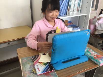 自分の発表を、見ています。うつり方や、伝える工夫を考えています。