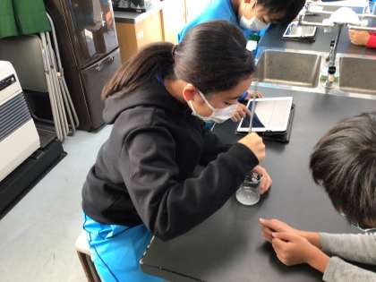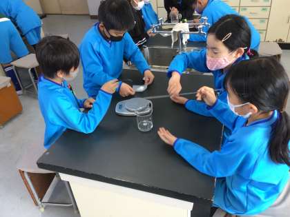 食塩とミョウバンを使って、ものの溶ける量には限界があるのか実験を行いました。みんなで協力して進めることができました。