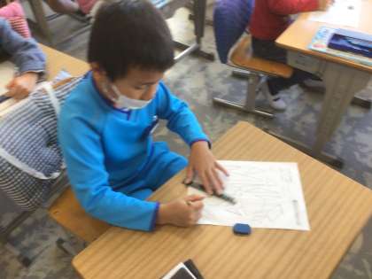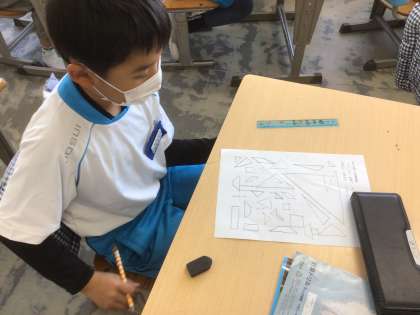 「三角形と四角形」の学習です。今日は、形分けをした後、点をつないで形を作りました。