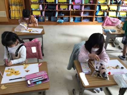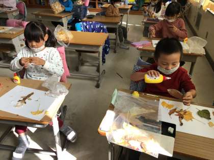 ひろった落ち葉やどんぐりを使って作品を作りました。