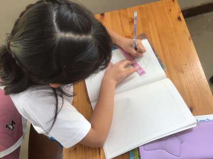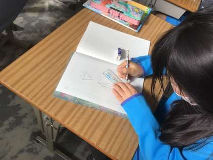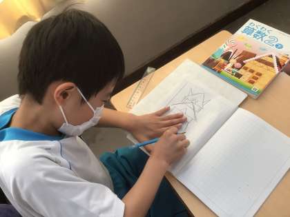 三角形や四角形をかいて、動物や虫、お城や建物を描いている子もいました。