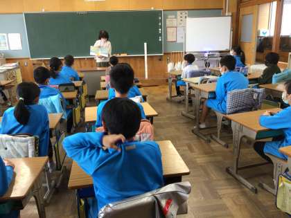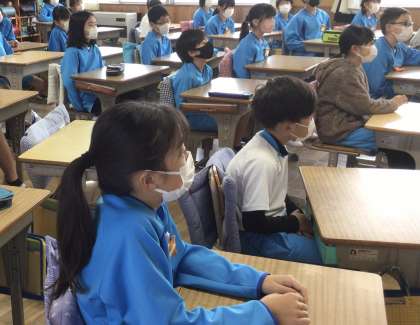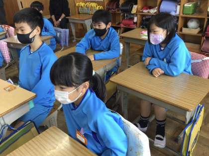 1組の読み聞かせの様子です。真剣な表情で聞いていました。