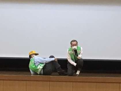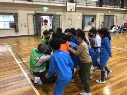教えていただいたことを、練習しました。「助けて〜」と、大きい声を出して、助けてくれる人がいる方に逃げます。また、捕まってしまった時の逃げかたも、おしえていただきました。