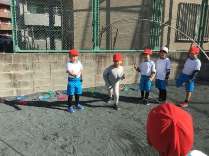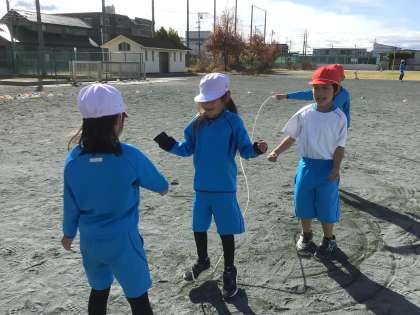 縄跳び練習です。グループごとに分かれて、長縄の8の字跳びです。まずは、跳べるように!