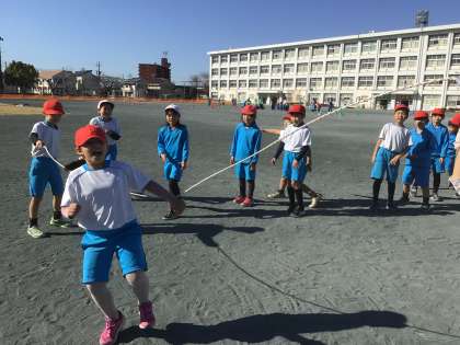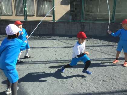 跳んだら、走って出る!を頑張りました。縄が跳べても、出るタイミングを逃したら、引っかかってしまいますね。入るのも、跳ぶのも、出るのも、コツが必要ですね。