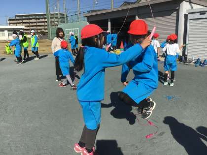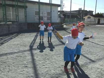 短い縄で、友だちと跳びました。みんな、とっても楽しそうです。