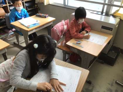 画用紙にまとめをしています。みんなが読みたくなる題名にも、こだわっていますよ!