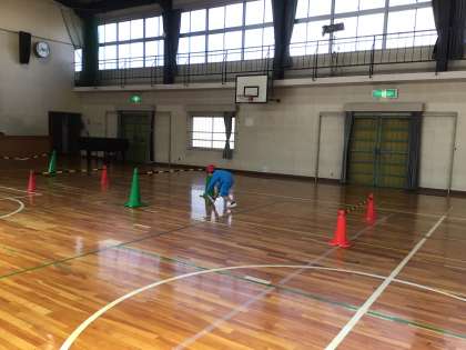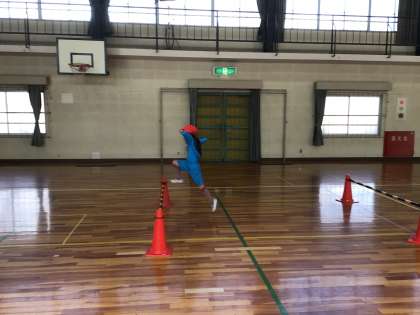 コーンを使って跳び遊びをしました。