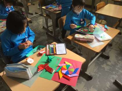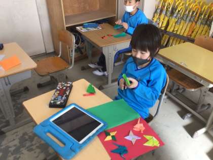 冬休み前に、カード作りをしました。折り紙で、飾りも作りました。