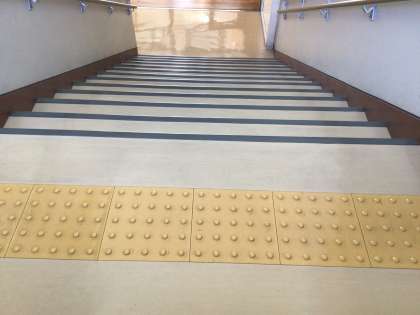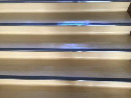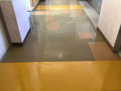 東階段がピカピカに光っています。丁寧に掃除をしてワックスをかけました。また、3・4組前の廊下の床を修繕しています。