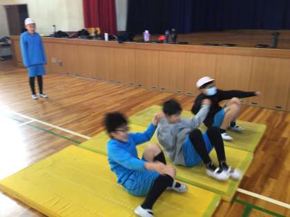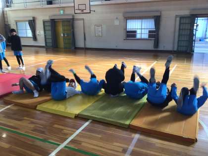 「マット運動」の学習の様子です。前転系の技をするときに、手をなるべく使わずに回れるようにすることで、回転力を高めて精度の高い技ができるようにしています。