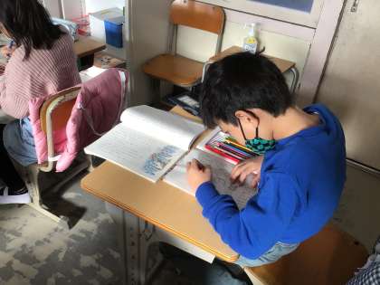 「かさこじぞう」の学習です。自分の好きな場面を選び、絵や言葉で表しています。色々な表現や思いに気付くといいですね。