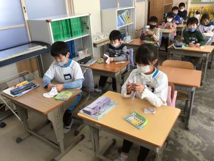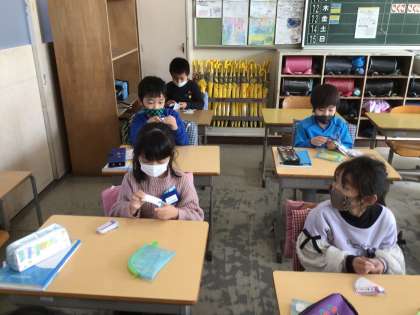 みんなで九九を練習しています。しっかりと覚えていますが、九九カードをもう一度使って正しく言えるように確認しながら練習しました。
