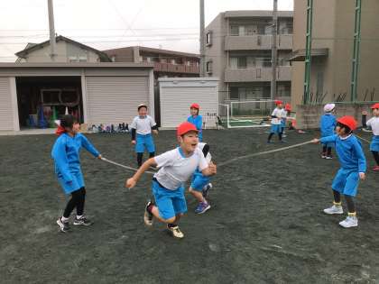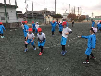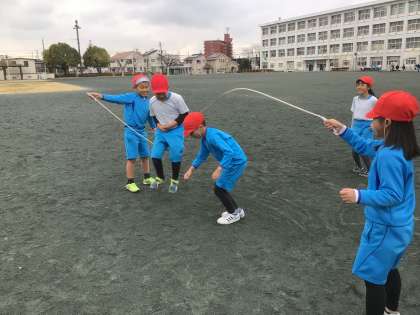 長縄では、友だちと協力して跳びました。跳ぶタイミングを合わせると、自然に笑顔になっています。「楽しい!もっと跳びたい!」という声も聞こえてきましたよ。