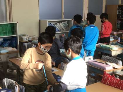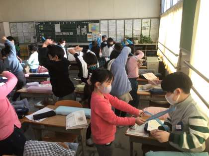 「なべなべそ〜こぬけ〜」の曲に合わせて、みんなで楽しみました。接触を防ぐために、ビニールひもを使ってくるりん、とまわりました。