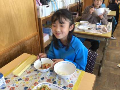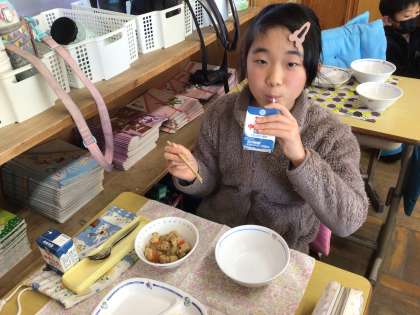 今日のメニューは、高野豆腐のうま煮、イワシの生姜煮、白菜とカブの酢の物、ご飯、牛乳でした。