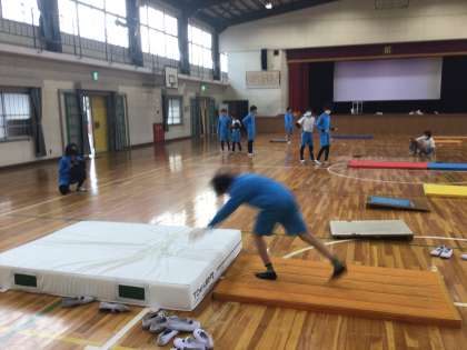 新しいセーフティマットを使って、「前方倒立回転跳び(ハンドスプリング)」に挑戦しています。