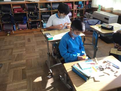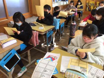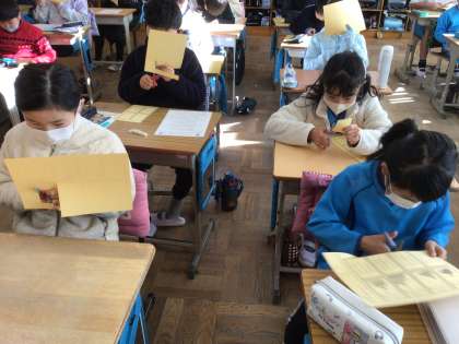 今日は、国語の授業で使う百人一首のカードを作りました。